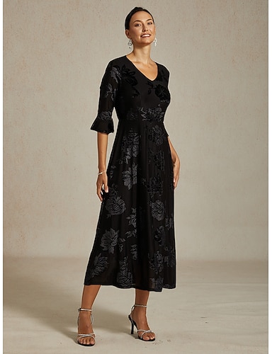 Damen Samt Midi Kleid A Linie Kleid Elegant Geburtstags Cocktail Hochzeitsgast Samt Alltag Cocktailparty Reguläre Passform Floral Halbe Ärmel V-Ausschnitt Marineblau Frühling Herbst Winter