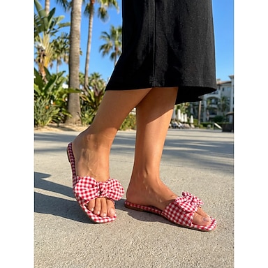 Damen-Sandalen mit rotem und weißem Vichy-Karo und Schleife – schicke, karierte, flache Pantoletten mit eckiger Zehenpartie für Inselurlaube, Kreuzfahrten und Strandurlaube