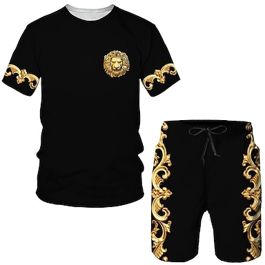 Herren Grafik 2St T-Shirts-Sets Sommeroberteile Kurzarm Kurze Hosen Rundhalsausschnitt Alltagstauglich Outdoor Sport Täglich 3D-Druck Sommer Schwarz