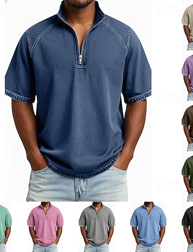 Herren Hemd aus 100 % Baumwolle in Säurewaschung T-Shirt Kurzarm Stehkragen Herbst Winter Frühling Herbst Einfach Vintage Streetwear Lässig Reißverschluss Stückgefärbt Basic Lässig Heim Straße