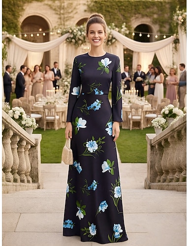 A-Linie Bodenlang Kleid für Hochzeitsgäste Abendkleid Brautmutterkleid Langarm Rundhalsausschnitt Elegant Formell Satin mit Blumenmuster
