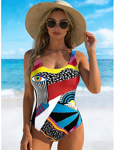 Damen Badeanzug Einteiler Hoher Schnitt Bademode Strandbekleidung Sommer Grafik Geometrisch U-Ausschnitt Ärmellos Badeanzüge