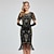 Set Goldene Zwanziger Vintage inspiriert Der große Gatsby Knielang Kurze Länge Flapper Kleid Outfits Partykostüm mit Zubehör Illusionsärmel Kurze Ärmel Der große Gatsby Hochzeitsgast Pailletten
