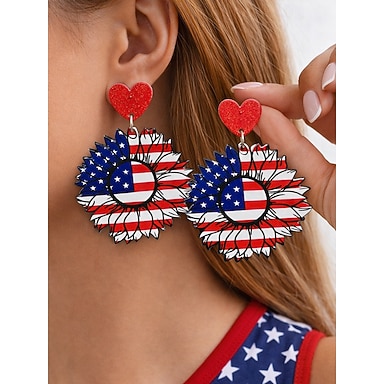 Patriotische Acryl-Ohrhänger für Damen, verschiedene Designs mit Sonnenblumen, Sternen und Herzen in Form der amerikanischen Flagge, ideal zum 250. Jahrestag der USA, zum Unabhängigkeitstag, für Freizeitkleidung sowie für Reise- und Urlaubsstyling.