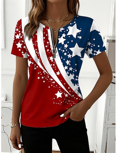 Amerikanischer Unabhängigkeitstag Damen T Shirt Reißverschluss Grafik Amerikanische Flagge Stilvoll Klassisch Lässig Kurzarm Rundhalsausschnitt Normale Oberteile Täglich Wochenende Blau Weiß Rote