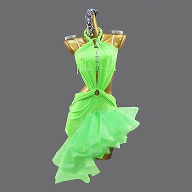 Tanz Salsa Latein Tanzkleid Strass Damen Performance Training ärmellos hoher Spandex Tüll