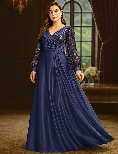 A-Linie Bodenlang Abendkleid Flattriges Kleid Langarm V Ausschnitt Elegant Vintage Übergröße Polyester Brautmutterkleid mit Falten Paillette