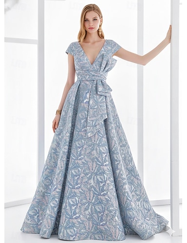 A-Linie Bodenlang Abendkleid Ballkleid Festliche Kleidung Elegant Blumen Hoher Schlitz Kurzarm V Ausschnitt Hochzeit Formell Tasche Jacquard Tiefer Wasserfall-Rückenausschnitt mit Blumenmuster