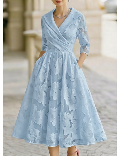A-Linie Knöchellänge Tee-Länge Hemdblusenkleid Abendkleid Brautmutterkleid Dreiviertelarm Hemdkragen Elegant Vintage Formell Hochzeitsgast Kentucky Derby Jacquard mit Falten Blume