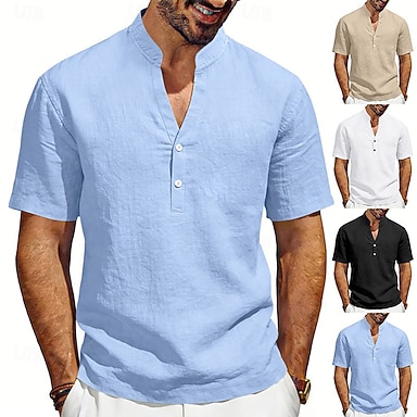 Herren Leinenhemd T Shirt Henley Hemd Kurzarmshirt Kurzarm V Ausschnitt Sommer Frühling Einfarbig Streetwear Stilvoll Lässig Patchwork Knöpfe Rein Lässig Täglich Outdoor Weiß Schwarz Kaki Top T-Shirt