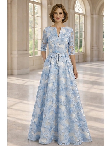 A-Linie Bodenlang Kleid für Hochzeitsgäste Brautmutterkleid Halbarm V Ausschnitt Elegant Einfach Verschönert Formell Spitze mit Gerafft Perlenstickerei