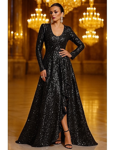 A-Linie Bodenlang Abiballkleider Abendkleid Ballkleid Festliche Kleidung Elegant Glitzernd Langarm Juwelenhals Weihnachten Schwarze Krawatte Herbsthochzeitsgast Paillettenbesetzt mit Gerafft