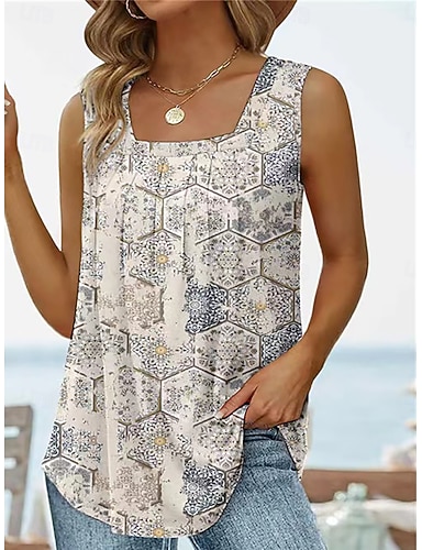 Damen T Shirt T-Shirt Gerafft Patchwork Druck Blumen Grafik Mode Klassisch Lässig Ärmellos Quadrathals Normale Oberteile Crop Tops Täglich Ausgehen Wochenende Blau Schwarz Weiß Wein Aprikose Sommer