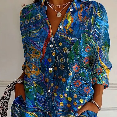 Damen T-Shirt Kurzarm Button-Down Bluse Floral Grafik Alltag Lässig Shirt Kragen Normale Tops Alltag Blau Sommer Frühling