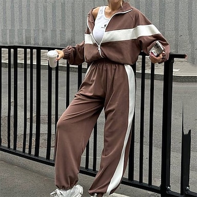 Damen 2-teiliger Trainingsanzug Gestrickte Trainingsanzüge Lounge-Outfits Reißverschluss mit Tasche Farbblock Sportbekleidungsset Sommer Frühling Weiß Fitnesstraining Joggen Laufen