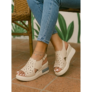 Beigefarbene Keilsandalen mit Blumenstickerei für Damen – stilvolles Design mit offener Zehenpartie und verstellbarem Riemen, perfekt für Freizeitaktivitäten, Sommerpartys und den Alltag.