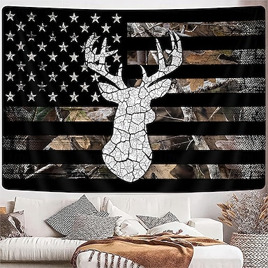 Wandteppich mit amerikanischer Flagge, Hirschkopf, Tarnmuster, Hirschgeweih, patriotischem USA-Motiv, Sternen und Streifen, rustikaler Männerhöhlen-Dekoration, Wandkunst