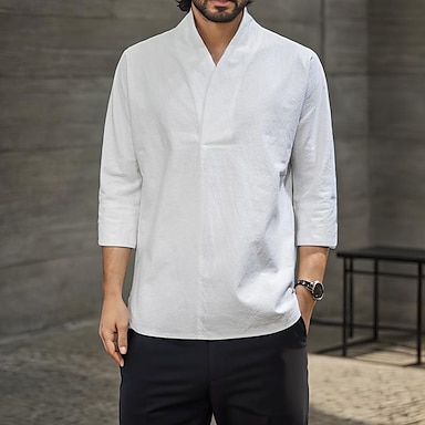 Herren Hemd Hemd aus Baumwollleinen Weißes Baumwollhemd Lässiges Hemd Glatt Hawaiianisch Festtage Schwarz Weiß Gelb Marineblau 3/4-Ärmel V Ausschnitt Frühling Sommer Bekleidung