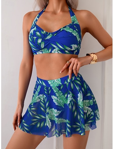 Damen Badeanzug Bikini Zweiteilig Rock Bademode Schlank Rückenfrei Urlaub Strandbekleidung Tropisch Neckholder Ärmellos Badeanzüge