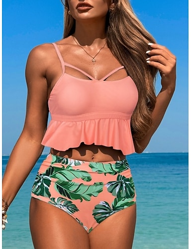Damen Badeanzug Bikini Zweiteilig Hohe Taillenlinie Bademode Hohe Taille Schlank Rückenfrei Urlaub Strandbekleidung Tropisch V Ausschnitt Ärmellos Badeanzüge