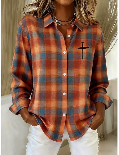 Damen Hemd Durchgeknöpft Hemd Freizeithemd Bluse Knöpfe Karomuster Vintage Stilvoll Klassisch Langarm Hemdkragen Normale Oberteile Täglich Ferien Ausgehen Orange Sommer Frühling