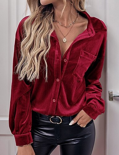 Damen Hemd Samt Elegant Bluse Patchwork Tasche Knöpfe Einfarbig Einfach Elegant Damen Stilvoll Langarm Hemdkragen Lange Oberteile Täglich Arbeit Ferien Rosa Armeegrün Leicht Braun Purpur Herbst Winter