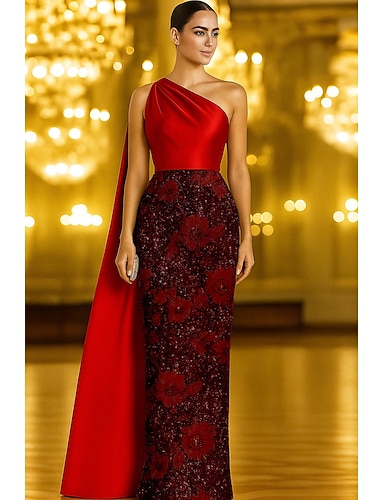 Schlauchkleid Bodenlang Perlenbestickt Abendkleid Kleid der Brautmutter Ballkleid mit Cape Abendkleid Festliche Kleidung Elegant Glitzernd Glitzern Ärmellos Ein-Schulter Hochzeit Formell Capes Satin