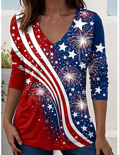 Unabhängigkeitstag patriotisches Damen T-Shirt Druck Grafik amerikanische Flagge Vintage stilvoll klassisch Langarm V-Ausschnitt reguläre Oberteile täglicher Wochenend Schwarz Rot Rot Blau Sommer
