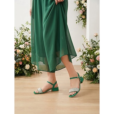 Grüne Damensandalen mit Blockabsatz und kristallverziertem Riemen, elegante Schuhe für die Mutter der Braut bei einer Gartenhochzeit, bequeme Sandalen mit niedrigem Absatz für eine Trauung im Freien