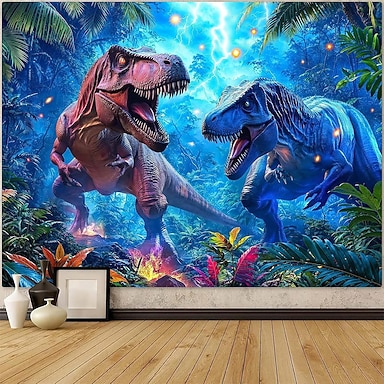 Wandteppich mit Dschungel-Dinosaurier-Motiv: T-Rex, blau und rot, Blitz und Himmel, Kinderzimmer, Spielzimmer, Gaming-Zimmer-Hintergrund