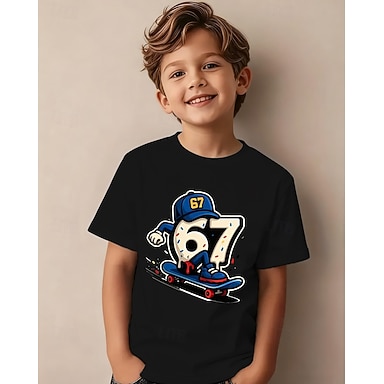 Baumwolle Kinder Jungen Schwarz Weiß Grafik Lustiger Slang 67 T-Shirt Bluse Rundhalsausschnitt Kurzarm Outdoor Alltagskleidung Mode Streetwear Designer Drucken Sommer