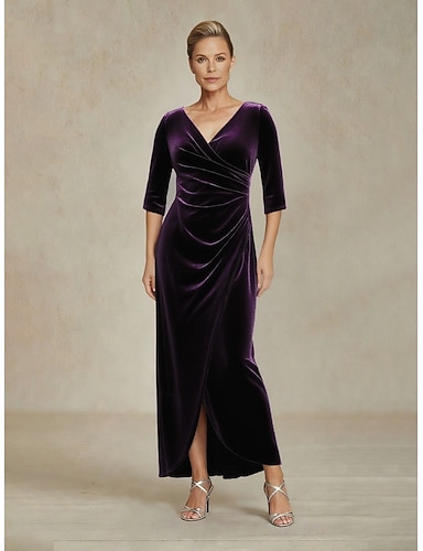 Damen Maxikleid Wickelkleid Elegant Hochzeitsgast Abendgesellschaft Cocktailparty Einfarbig Dreiviertelarm V Ausschnitt Aubergine Winter