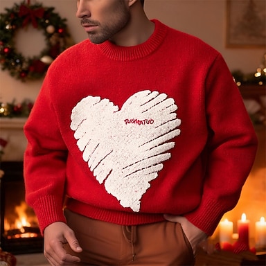Herren Weihnachtspullover Pullover Fair Isle Sweater Strickpullover Gerippt Stricken Normale Oberteile Gestrickt Herz Rundhalsausschnitt Vintage Mode Weihnachten Urlaub Bekleidung Herbst Winter Rot S