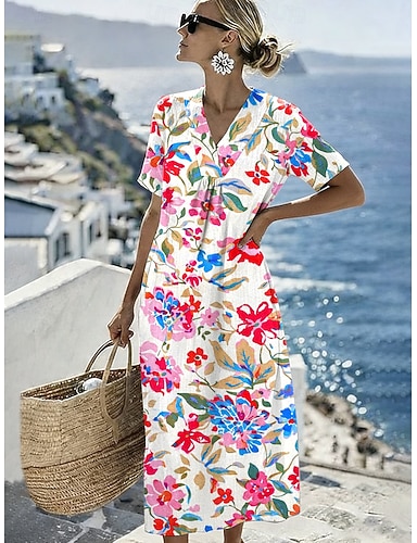 Damen Midikleid Shiftkleid Sommerkleid Urlaub Lässig Strand Täglich Ausgehen Normale Passform Ombre Blumen Grafik Kurzarm V Ausschnitt Blau Rosa Rote Grün Sommer Frühling