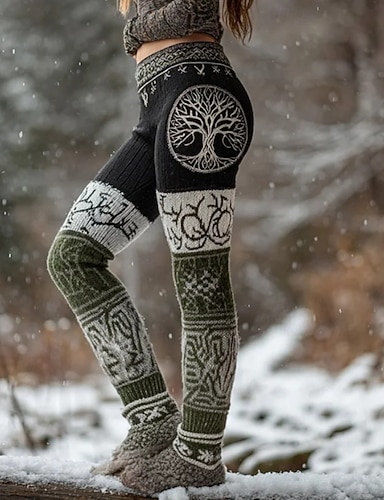 Damen Vikinger Leggings Gemütliche Leggings Urlaub Vintage Ethno-Stil Volle Länge Hohe Taille Grafik Drucken Bequem Dehnbar Lässig Täglich Urlaub Grün Frühling Herbst Schmale Passform