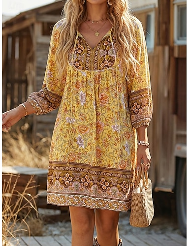 Damen Minikleid Boho-Kleid Freizeitkleid Druckkleid Elegant Mode Modern Outdoor Strand Urlaub Normale Passform Blumen Langarm V Ausschnitt Gelb Rosa Marineblau Orange Sommer Frühling