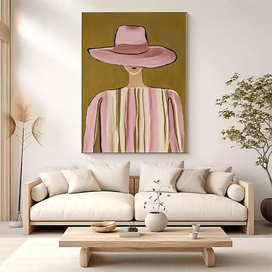 Handgemaltes abstraktes Porträt einer Frau mit rosa Hut, moderne figurative Leinwandkunst, zeitgenössisches minimalistisches Wandbild in Salbeigrün mit Struktur