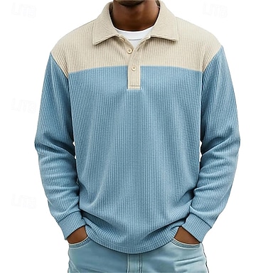 Herren Waffel-Poloshirts Poloshirts Lässig Straße Revers Langarm Basic Modern Farbblock Patchwork Knöpfe Frühling Herbst Normale Passform Schwarz Hellgrün Marineblau Grau Leicht Blau Waffel-Poloshirts