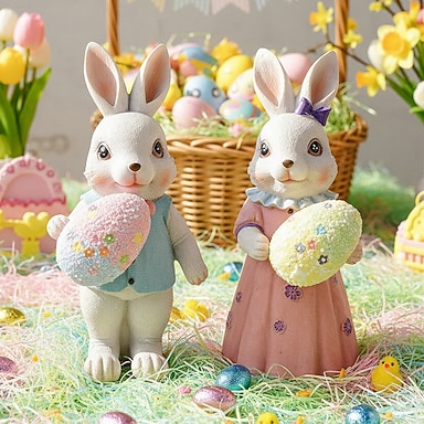 Osterhasenfigur aus Kunstharz, niedliche Cartoon-Hasenfigur, handgefertigte Osterdekoration aus Kunstharz für Zuhause, Tisch und Garten &Gartendekoration