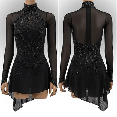 Eiskunstlaufkleid Damen Eislaufen Kleid Schwarz Patchwork Asymmetrischer Saum Hohe Elastizität Training Wettbewerb Eiskunstlaufkleidung Klassisch Kristall / Strass Langarm Eislaufen Eiskundstlauf