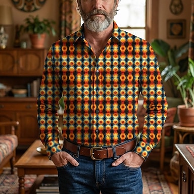 Retro Vintage 1970er Hemd Aloha-Hemd langarm Hippie Geometrisch Kostüm Herren Maskerade Musikfestival Party Alltagskleidung Erwachsene Hemd