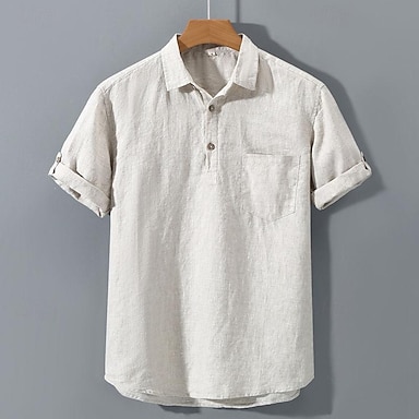 Herren Hemd Leinenhemd Popover-Hemd Freizeithemd Baumwollhemd Einfach Urlaub Hawaiianisch Schwarz Weiß Aprikose Grau Dreiviertelarm Stehkragen Sommer Frühling Bekleidung Button-Down