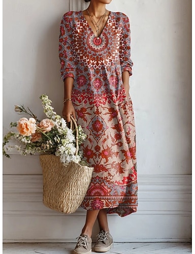 Damen Maxikleid A Linie Kleid Urlaub Lässig Boho Strand Normale Passform Blumen Grafik Langarm V Ausschnitt Rote Blau Purpur Grün Frühling Herbst