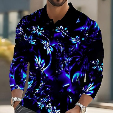 Herren Pflanzen Fluoreszierend Polo Langarm Polo-Shirts Revers Lässig Straße Athleisure Alltagskleidung 3D-Druck Knöpfe Frühling Herbst Winter Blau Purpur Grün