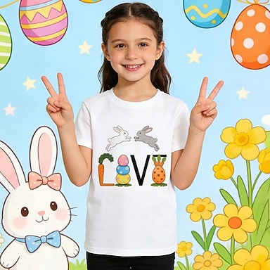 100% Baumwolle Ostern Kinder Mädchen Weiß Liebe Kaninchen T-Shirt Rundhalsausschnitt Kurzarm Urlaub Sport & Outdoor Alltagskleidung Aktiv Streetwear Lässig Drucken Sommer Frühling