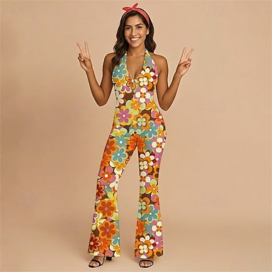 Retro Vintage 1970er Overall Hippie Halter Blumen Kostüm Damen Halloween Karneval Maskerade Party Alltagskleidung Erwachsene Jumpsuit Sommer