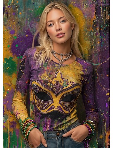 Karneval Damen T-Shirt Grafik Vintage Mode Stylisch Langarm Rundhalsausschnitt Reguläre Oberteile Tägliche Party Abendkleidung Wochenenddruck Regenbogen Frühling Herbst Winter