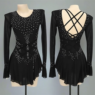 Eiskunstlaufkleid Damen Eislaufen Kleid Schwarz Patchwork Offener Rücken Dehnbar Training Wettbewerb Eiskunstlaufkleidung Klassisch Kristall / Strass Langarm Eislaufen Eiskundstlauf