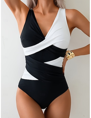 Damen Einteiler Badeanzug Rüsche Colorblock Monokini Hohe Taille Slim Rückenfrei Elegant Urlaubs Farbblock V-Ausschnitt Ärmellos Bademode