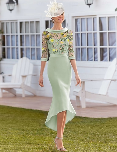 Meerjungfrauenschnitt Kleid Asymmetrisch Tee-Länge Partykleid Cocktailkleid Kleid für Hochzeitsgäste Brautmutterkleid Halbarm Juwelenhals Elegant Vintage Formell Hochzeitsgast Stretchstoff mit Spitze